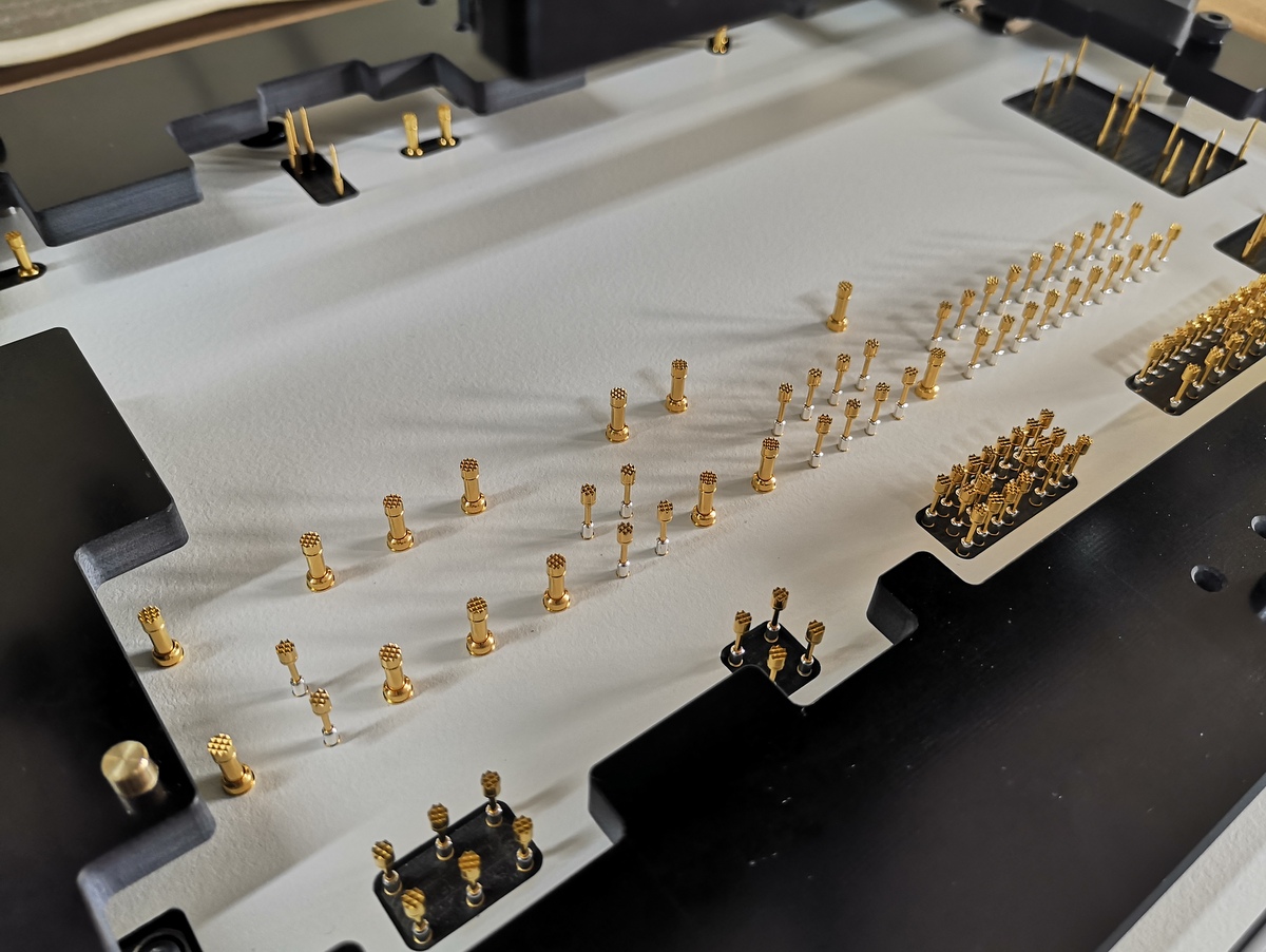 The DUT nest is a unique part of each test system. It must be designed and manufactured according to the size and arrangement of the test points of the circuit under test. In addition to the nest, a push plate must be designed.